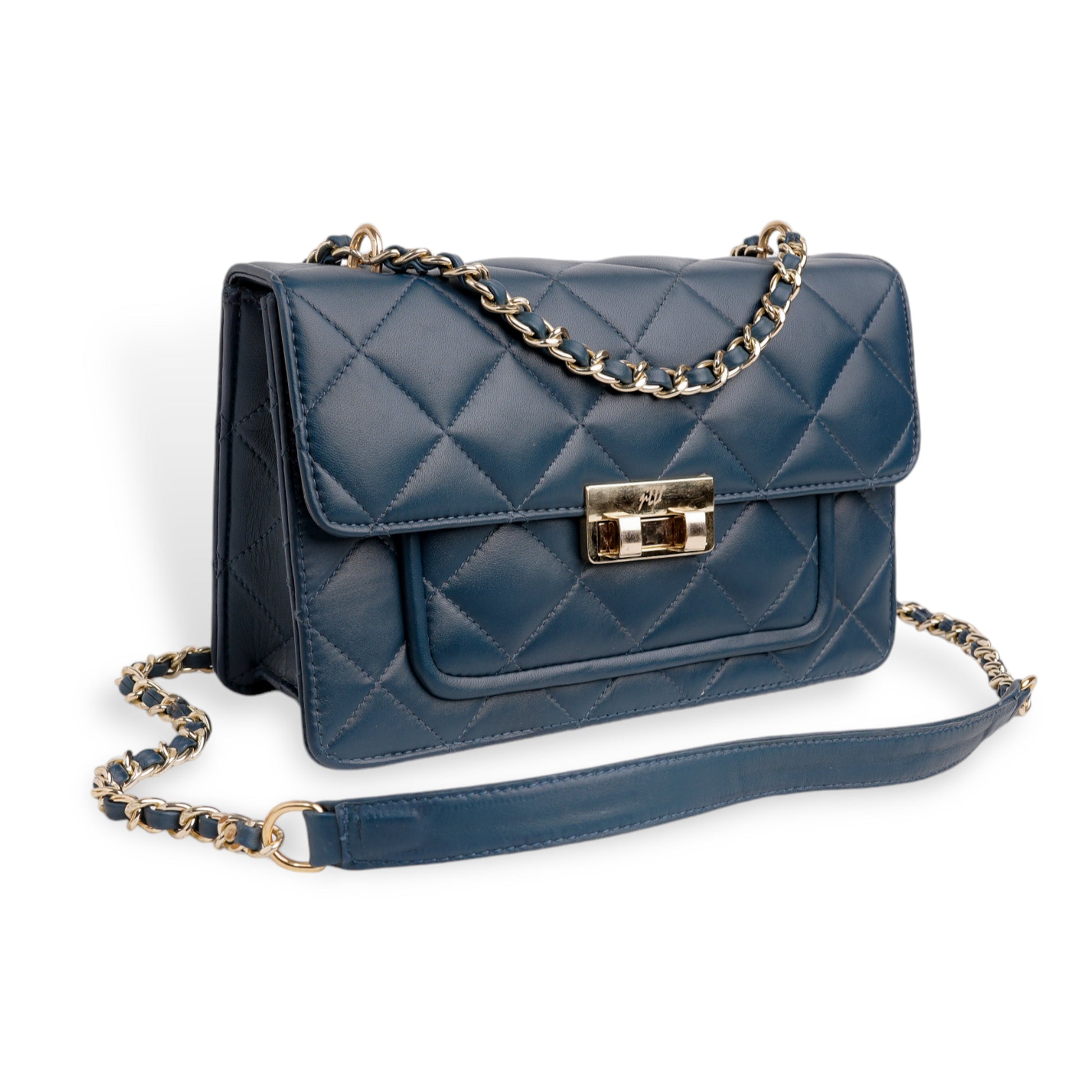 Introducing Flora Bag By Jild- Our new range of mid-size crossbody shoulder bags with genuine quilted leather detailing. The pull-through chain strap allows you to convert this so-chic, quilt-textured bag from shoulder to crossbody with ease. The spacious interior includes a front pocket compartment and an inside slip pocket to safely carry your phone and essentials. Featuring a secure turn lock closure, this bag combines style and functionality perfectly.