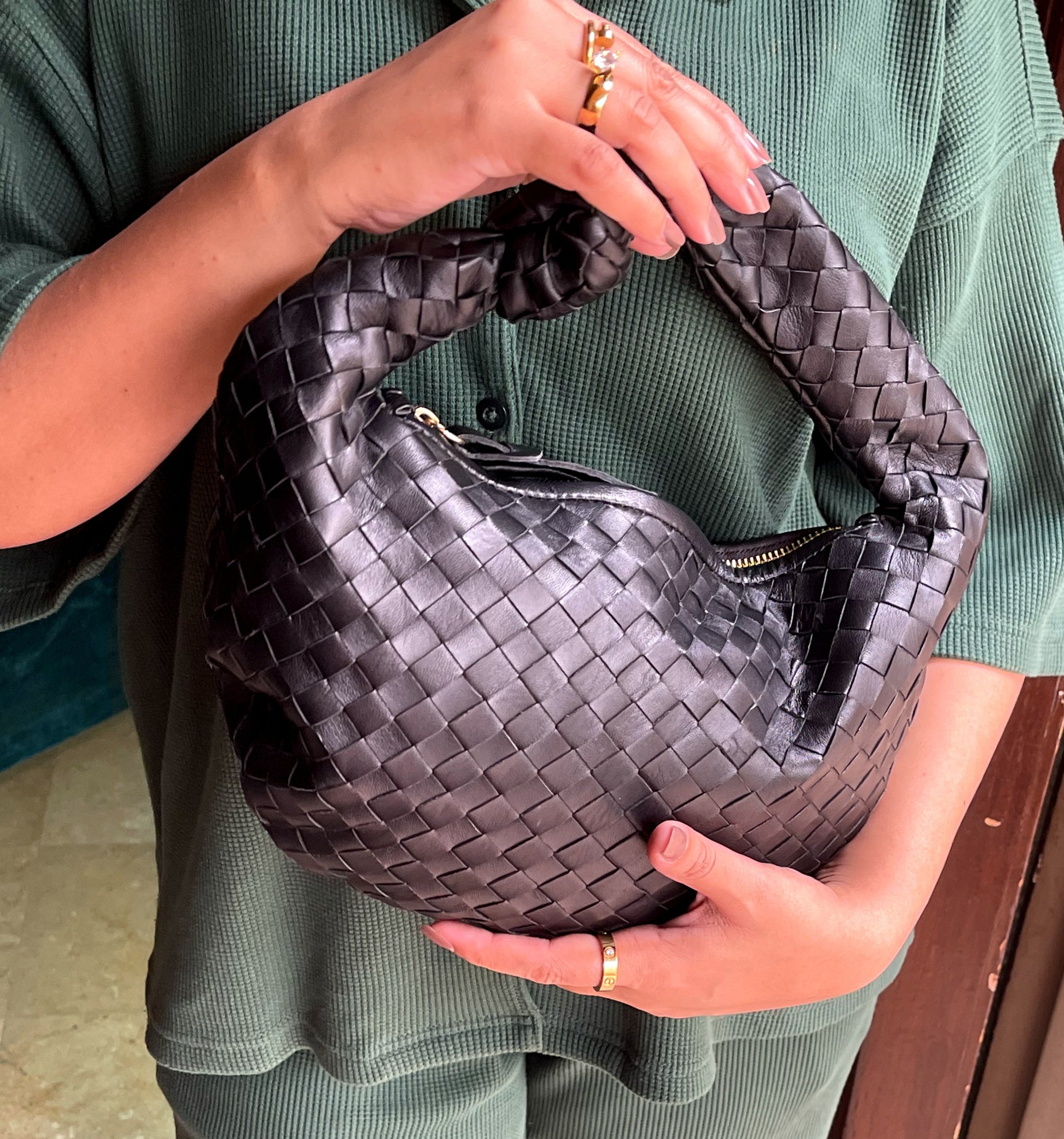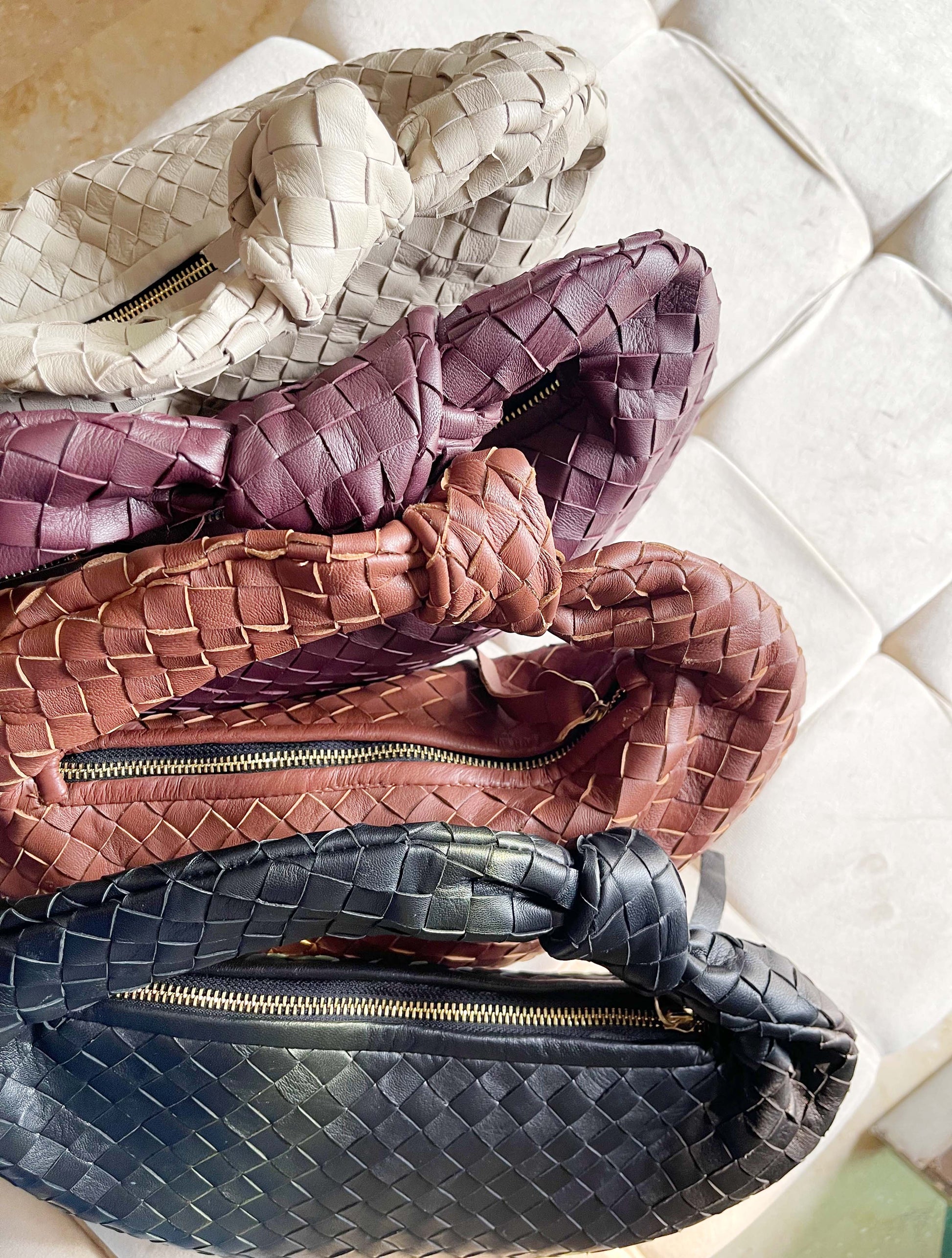 Crafted with premium woven leather, this handbag is a must-have for your collection. Its signature knot handle adds a unique touch to the classic silhouette. Made with buttery-soft real lamb-skin leather, ensuring durability and a luxurious feel.
