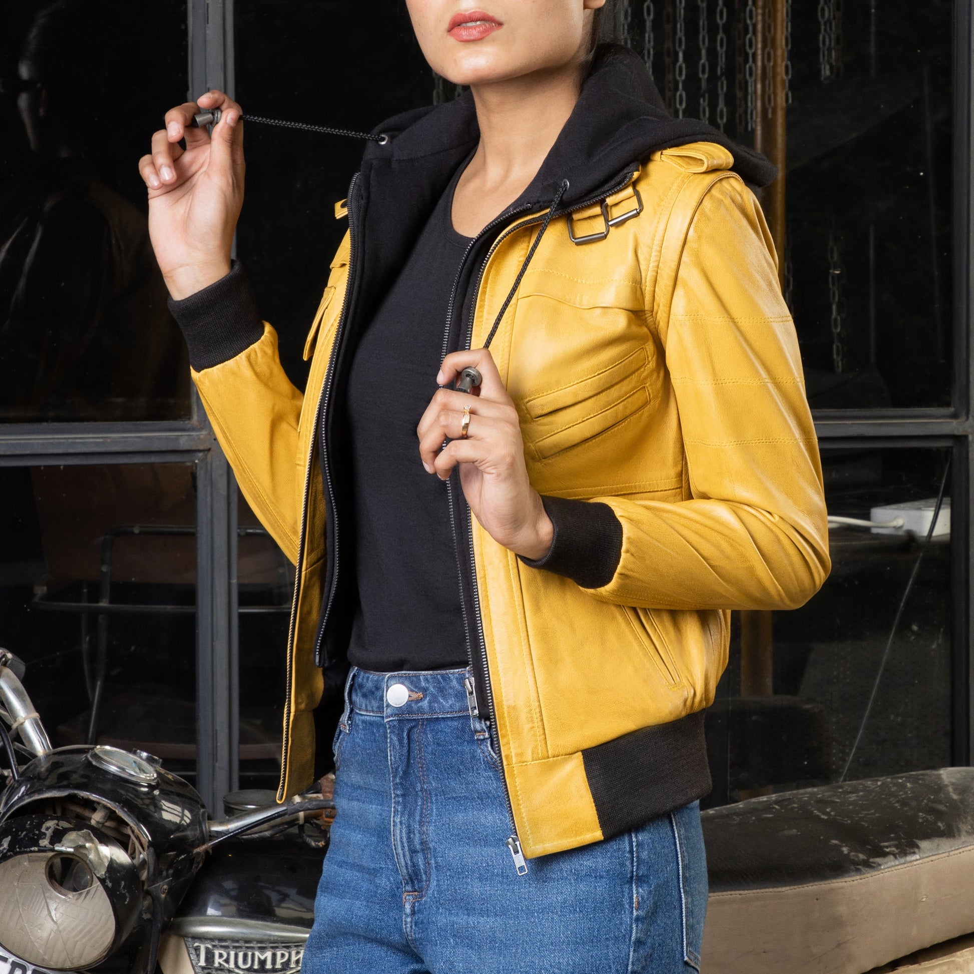 Experience the ultimate in versatility with the Women’s Biker Style Real Leather Jacket featuring a removable knit hood and front panel. Crafted from premium 100% real leather, this jacket offers a sleek biker look with the added comfort of a cozy knit hood and panel, which can be removed to suit your style. Whether you’re going for an edgy biker look or a casual, laid-back vibe, this jacket adapts to your needs with ease.